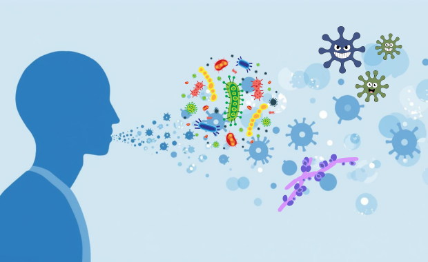 ウイルスに感染している人が咳やくしゃみをすると、ウイルスが飛び出して広がります。感染者の近くにいる人がこれを吸い込むと、ウイルスに感染する危険があります。