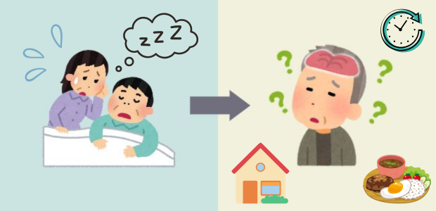 また、アルツハイマー型認知症に関与するタンパク質・アミロイドβは、睡眠中に排出される老廃物なので、睡眠不足だと、脳内に蓄積されやすくなります。