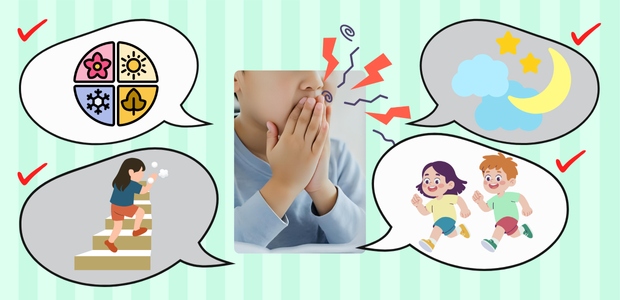 夜中や明け方に咳がひどくなったり、体育の後に咳が止まらなくなったりする症状は、小児喘息の可能性があります。
